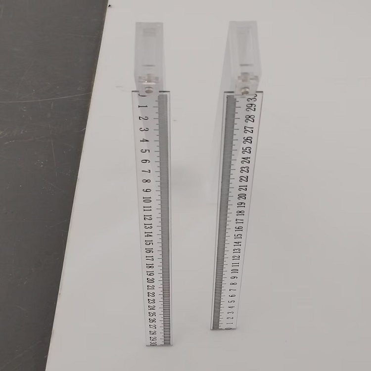 无铅不透射线尺是专为放射诊疗领域设计的高精度测量工具,采用环保材质替代传统含铅材料,彻底规避铅金属长期接触引发的健康风险。其核心基材为高纯度亚克力(酸),具备极低射线吸收性,确保在X光或荧光透视下无背景影像干扰,同时表面嵌入特定合金刻度线,实现清晰的不透射线显影效果,刻度精度达毫米级,满足临床对尺寸标记的严苛要求。标准规格涵盖30cm、45cm、55cm至165cm等多种长度,宽度可选25mm、30mm或45mm,厚度通常为1.5mm或3mm,并支持非标定制,如十字校准型、折叠便携式或带原点居中设计的专用尺。关键结构优化包括内置橡胶防滑装置保障定位稳定性、90°基准线辅助吻合角度校准,以及双面刻度(厘米/英寸)适配国际标准。