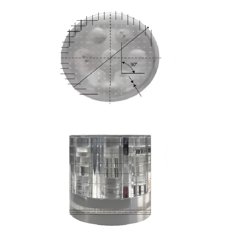 锥形束CT性能模体是专为口腔锥形束CT(CBCT)设备质量控制设计的精度检测工具,由直径15cm~17cm(常见160mm)的PMMA圆柱体构成,整体厚度不小于45mm,材质具备优异的光学透明性与机械强度。其核心模块包括: